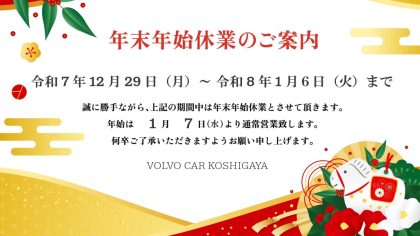 ボルボ・カー越谷のホームページをご覧いただきましてありがとうございます。誠に勝手ではございますが、当店は令和7年12月29日(月)~令和8年1月6日(火)まで年末年始のお休みをいただいております。万が一の事故やトラブルの際は、ロードサービスをご利用下さいませ...